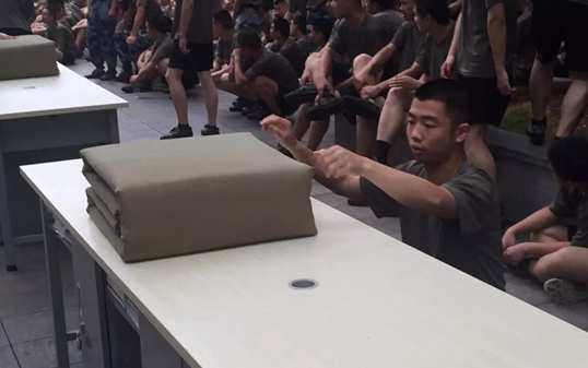 士官学员认真地整理被子细节
