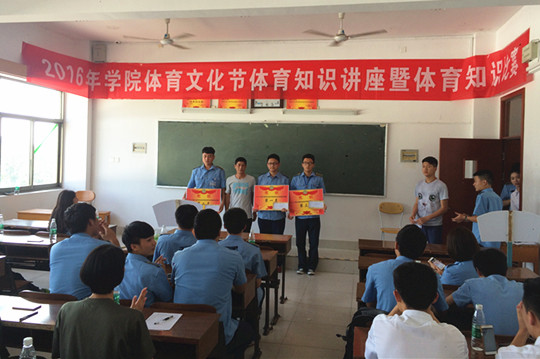 5月12号下午,2016年体育文化节系列活动之体育知识竞赛在电子楼306教室举行。竞赛由体育工作(教学)部杨晓波老师主持,6个二级学院共计36名学生代表参加。比赛以抢答的形式进行,各参赛单位代表在体育知识抢答时表现积极。最终,基础教育学院代表队获得第一名,航空机械制造学院代表队获得第二名,航空电子设备维修学院代表队获得第三名。(院学生体育部 供稿)