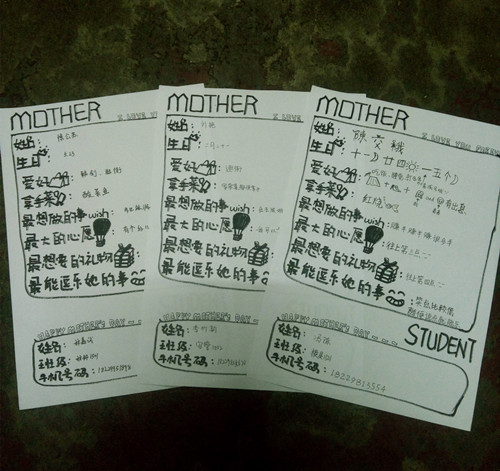 在场的每位同学都拿到了一张“亲情档案”,这是一张简单而又特殊的信息表格,不是填写自己,而是填写自己母亲的信息。上面除了“姓名”、“生日”、“爱好”等基本信息外,还有“妈妈最大的心愿”、“最想做的事”、“最想要的礼物”等栏目。在这部分,就有不少同学犯起难。不少同学羞愧地表示,对于妈妈自己有太多不了解的地方,有的同学的表格内容是通过给妈妈打电话才完成的。同学们纷纷意识到相比父母,自己对他们的付出和关心真是太少太少,都表示今后一定会更用心的了解家人,更多的关心家人。
