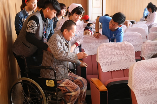 同学们一抵达福利院便积极主动帮忙搬运由湖南省文化馆运来给老人的慰问品,随后在工作人员的引导下井然有序的将老人从呵护中心搀扶到节目现场(文化馆组织的《我是雷锋家乡人》活动现场),活动过程中与老人亲切交谈。同学们用行动诠释了助人为乐,敬老爱老的雷锋精神。