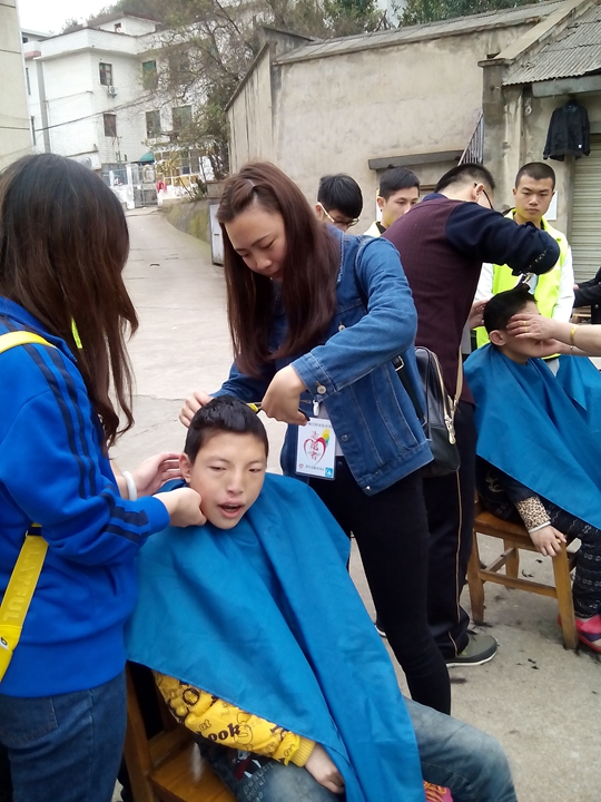 志愿者为孩子们理头发