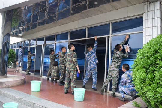 认真擦拭玻璃,清洗地面