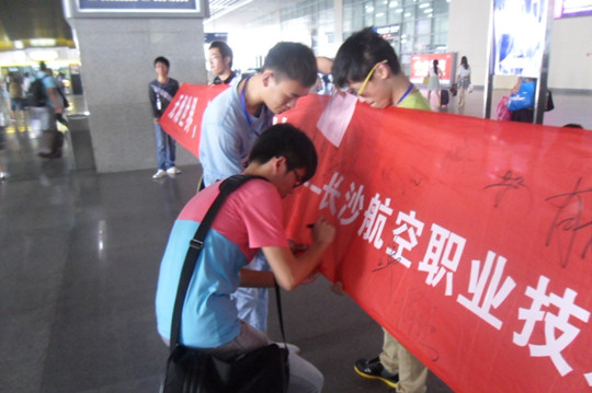 5月30日,在长沙高铁站主要出口附近,基础教育学院十余名学生以“无烟世界,清新一片”、“拒吸第一支烟,做不吸烟的新一代”为口号,进行“禁烟”主题的校外宣传实践。