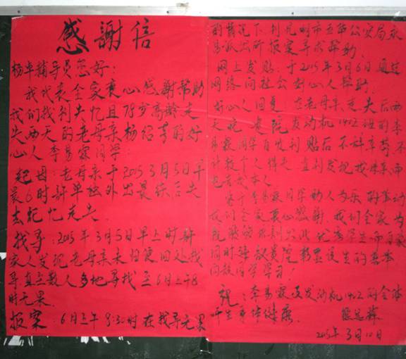 事情的经过是这样的:3月5日6时许,熊远辉的母亲单独晨练时不幸走失,全家人找寻一天后无果。由于其母亲已经78岁高龄且患有失忆症,全家人焦急不已。3月6日8时,熊远辉先生到派出所报案并在网上发布了寻人启事,但一天下来也无任何音讯。就在全家人焦虑苦等的时机,接到了李易霖的报信电话,全家人都非常激动。
