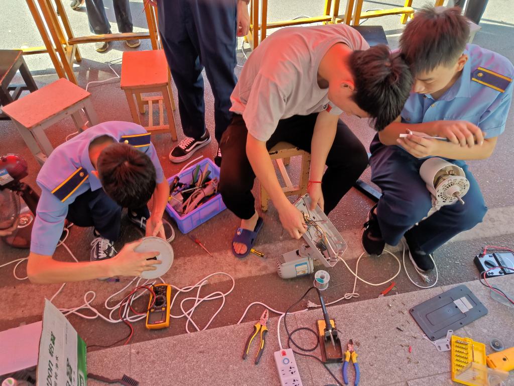 活动正式开展前一天,电子协会的同学组成宣传小分队,从学院北门新田小学至新田村沿路进行入户宣传,争取将受众面积做到最大化,为周边居民提供便利服务。22日上午八时,义务维修正式开始之前,我们在南门所设置的维修服务点已经有不少居民前来排队咨询,他们将自家需要维修的电器拿出来,与同学们进行交流协商,告知需要维修的部分,同学们热情的为居民们进行解答。九时许,我们的准备工作就绪,场面一度火爆,居民们将自家的电器如数家珍的拿出来,霎时间摆满了电水壶、风扇、电吹风、电磁炉等电器。在这次活动中,电子学院学生秉承“不怕苦、不怕累”的精神,当天在现场共计修理成功大小电器50件,顺利完成了此次义务活动,更有一些电器因元器件暂时不足登记在册进行后期修理。