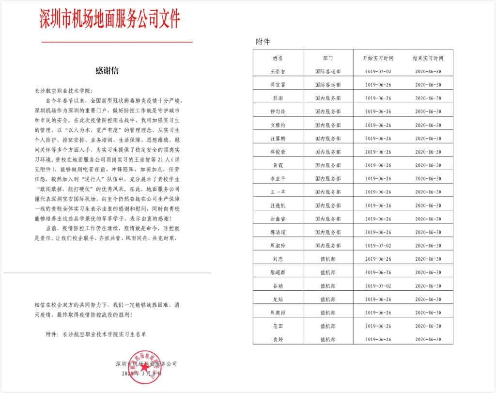 近日,我院收到校企合作单位深圳市机场地面服务公司发来的感谢信,对我院21名正在该公司顶岗实习同学的突出表现给予了高度评价,同时对我院良好的育人成效表示由衷地感谢和认可。