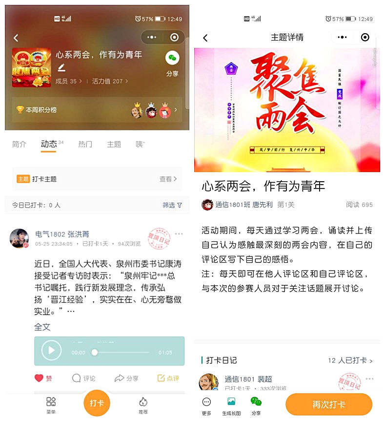 为学习贯彻第十三届全国人大三次会议和全国政协第十三届三次会议精神,电子学院于5月24日起在微信“小打卡”程序发起了以“心系两会,做有为青年”学习两会精神为主题的线上活动,此次活动历时五天,共吸引数百名同学参与。