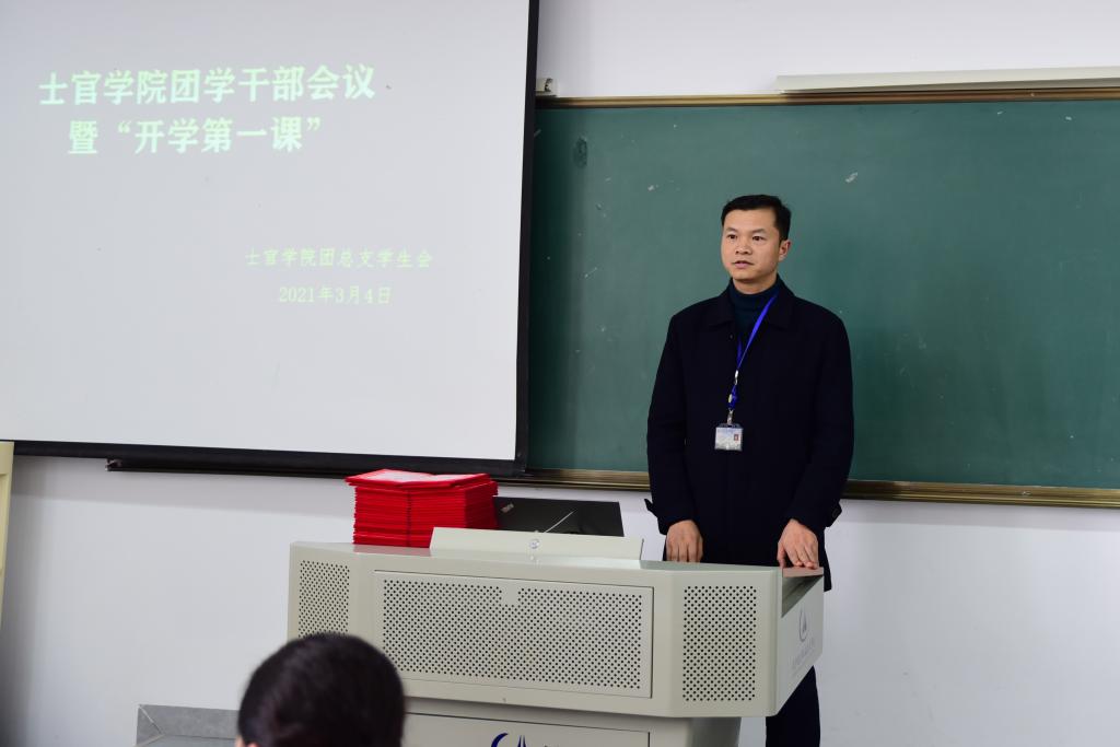 士官学院党总支对此次会议高度重视,首先由曹志刚副书记围绕新年度团学工作“抓什么”“怎么抓”,从思想政治教育、学风作风建设、日常训练管理及干部队伍建设进行部署。最后曹副书记对团学干部如何履好职、如何尽好责提出以下几点要求:一是要求团学干部一定要做好表率、发挥模范带头作用,无论学习、训练、作风养成、日常表现都要以身作则、先干一步;二是要求团学干部一定要树牢服务理念,要把做好同学的“服务员”作为第一要义,及时了解掌握同学们的困难,力所能及给予帮带;三是要求团学干部一定要当好老师的助手,工作要有质量、有效率、有创新,要在各自的岗位平台上贡献自己的力量。