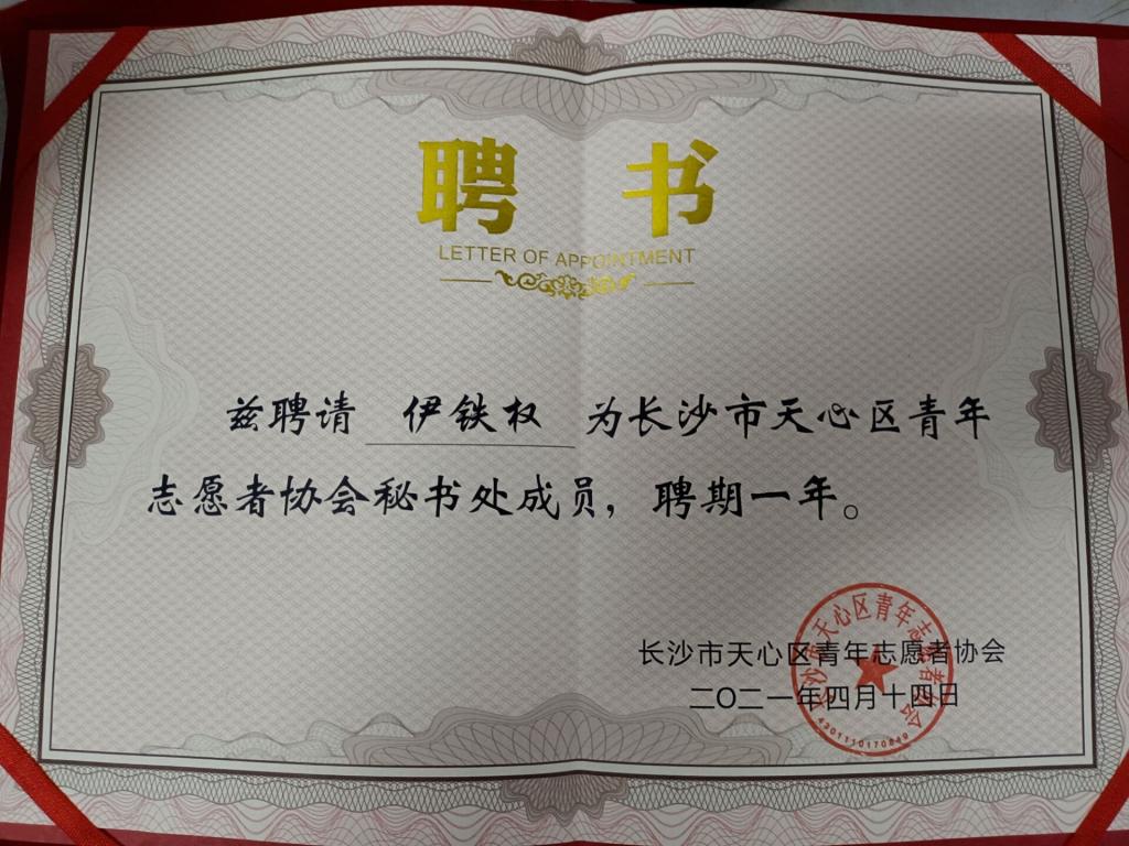 伊铁权同学当选会天心区青志协秘书处成员