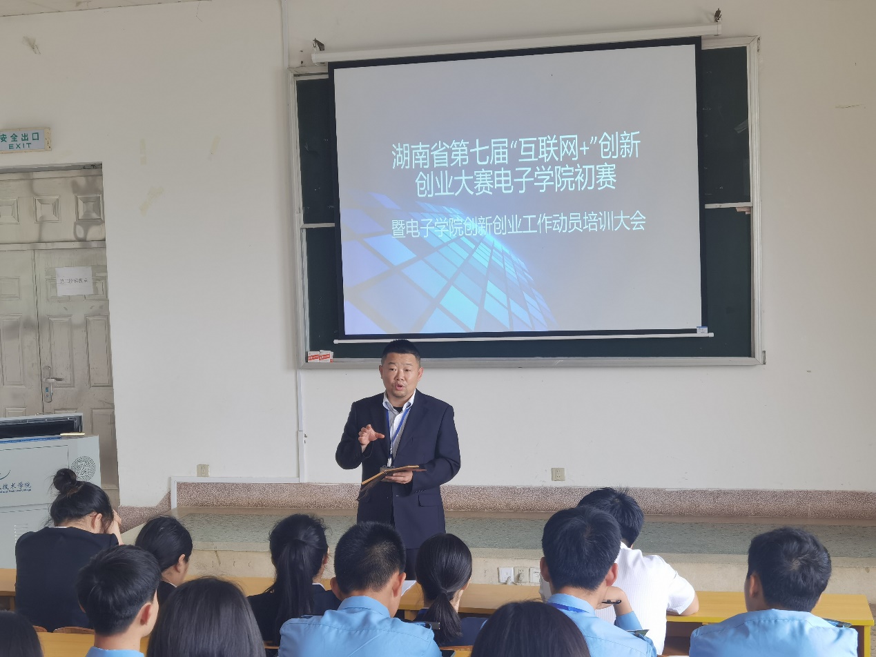 5月25日,电子学院在第二阶梯教室开展湖南省第七届“互联网+”创新创业大赛电子学院初赛暨电子学院创新创业工作动员培训大会。电子学院党总支书记于艺涛、就业助理孟勇、学生助理罗惠、全体辅导员及各班班团干部参加了此次培训大会。
