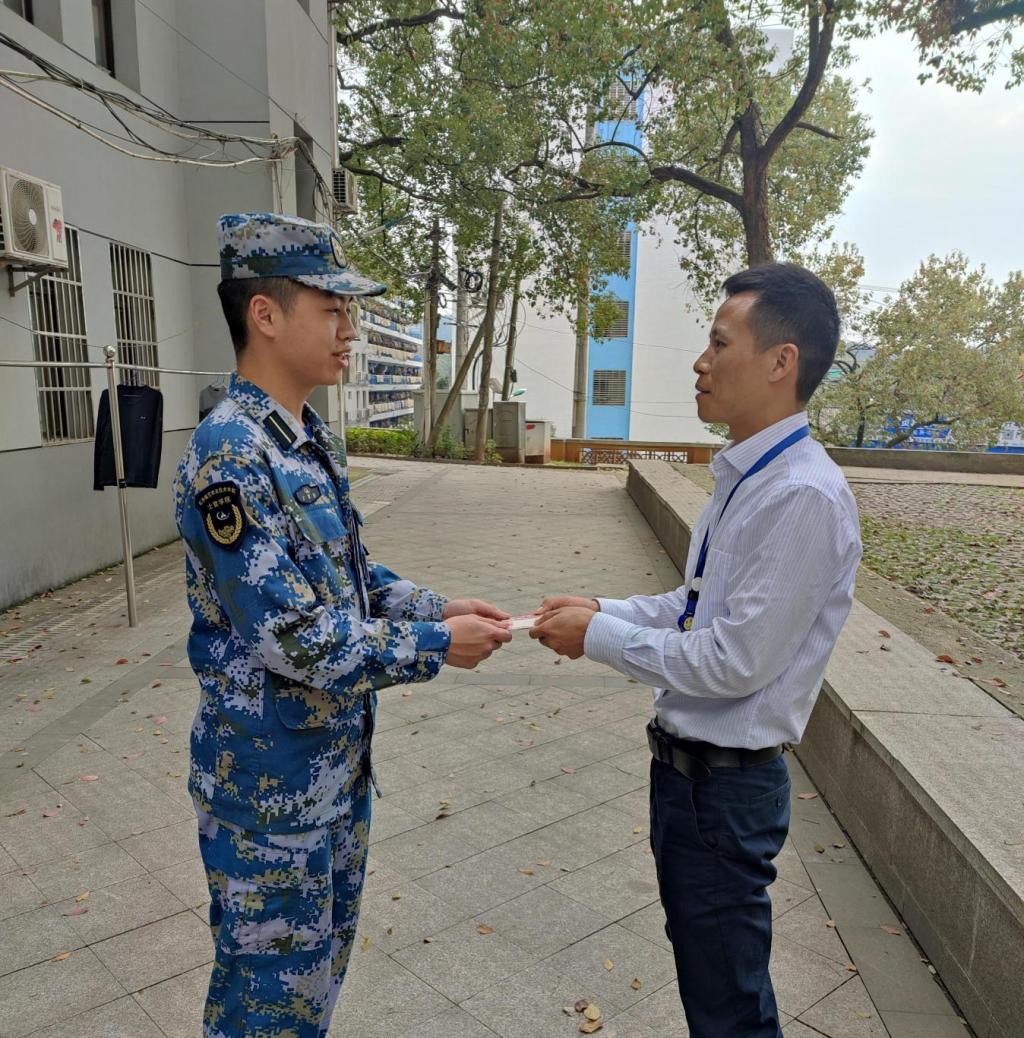 “当天晚上,我是在宿舍查铺查哨,检查士官生就寝及人员在位情况,因天气炎热就把外套提在手上,不慎把现金掉了出来。我非常感谢何京洛同学,同时为培养这么优秀的士官生感到自豪。”失主邓中付老师说。
