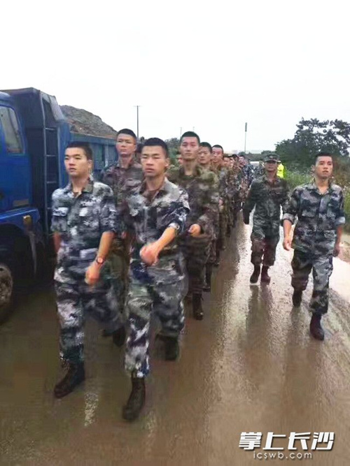 长沙航院士官学员民兵连奔赴新的抗洪战场。