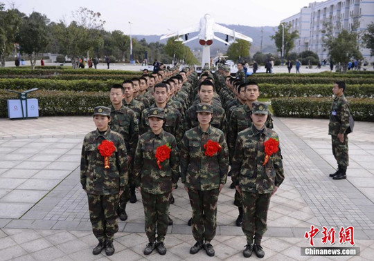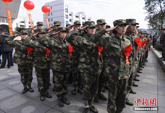 12月28日,澳门十大靠谱的网站2014级定向培养士官入伍欢送仪式在跳马校区举行,400余名士官学员将奔赴军队,队伍中仅有的五位女生也成为了湖南省首批定向培养入伍的女士官。图为即将入伍的士官学员们敬军礼。 杨华峰 摄