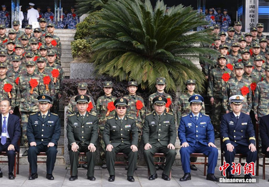 大一新生为五位女士官学员送行。