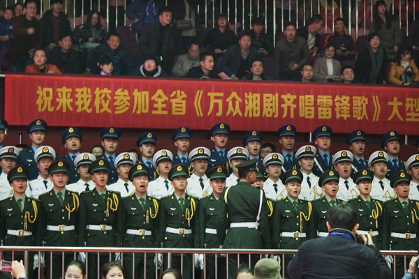 活动现场,该院陆海空士官学员齐唱《学习雷锋好榜样》拉开活动序幕,台下学员集体齐立相互应,“学习雷锋好榜样、忠于革命忠于党”响彻全场,推进活动走向高潮。而士官学员三军仪仗队花枪表演一出场就惊艳了现场万余志愿者。海军、陆军士官学员表演的是平面旋转和原地转枪,而空军士官员则展示了行进间转枪。帅气的表演引发了全场喝彩,掌声雷动。随后,万名学雷锋志愿者在数百名湘剧艺术家的引导下,用通俗唱法和极富湖湘特色的湘剧艺术形式来唱《学习雷锋好榜样》。通过这种传统文化创新的方式,全民齐唱、联唱、传唱《学习雷锋好榜样》,引导全社会大力弘扬雷锋精神。现场,许多单位、志愿者团队和个人争相呼应,表示要深入学习雷锋精神,深度理解雷锋文化,以做雷锋人为荣!