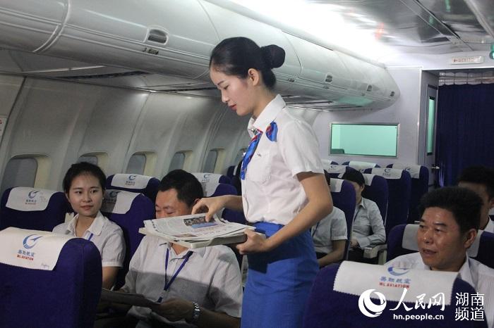 准空姐正在为老师发放报纸读物