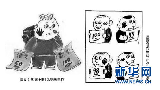 夏明漫画作品,右图为高考作文漫画,根据左图夏明原作改编