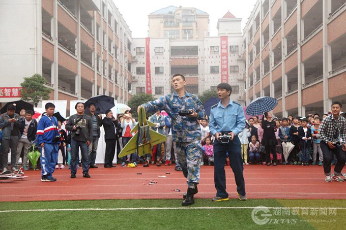 “哇——”同学们看着航模随着遥控的操作在操场上起飞,不约而同地发出惊叹。