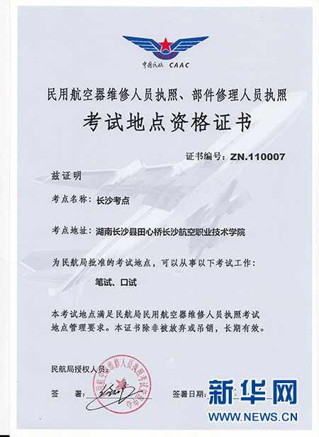 据了解,这是民航局首次批准在湖南设立民用航空器维修基础执照考点(简称“CCAR-66部考点”),该考点名称为长沙考点。12月1日,中国民用航空局(简称“民航局”)民用航空器维修人员执照考试管理中心主任任仁良亲手把民用航空器维修人员执照、部件修理人员执照考试地点资格证书(证书编号:ZN.110007)颁发给了澳门十大靠谱的网站航空装备维修工程学院副院长江游。