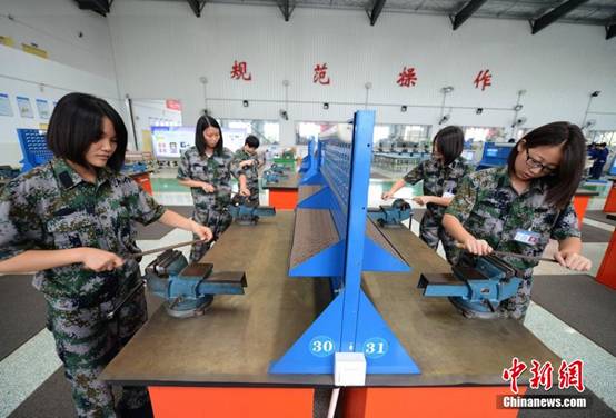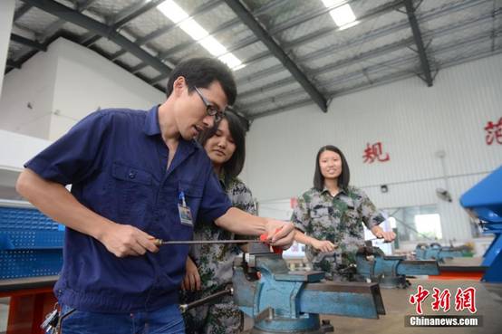 姑娘们在金工实训场内进行打磨铁棒的金工实操训练。杨华峰 摄