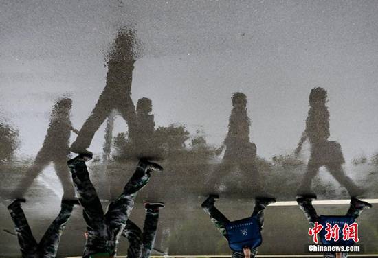 姑娘们与男学员一起练习队列队形。杨华峰 摄