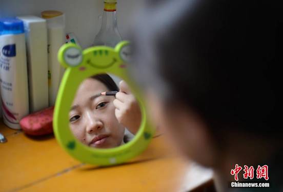 莫丽萍换便装前在镜前描眉。杨华峰 摄