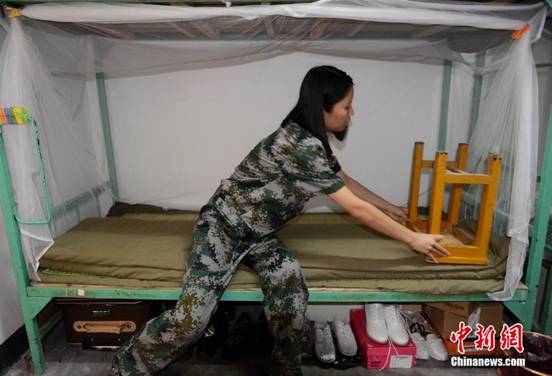 午休时间,姑娘们在寝室需要整理内务,邓蕊正在利用凳子叠被子。杨华峰 摄