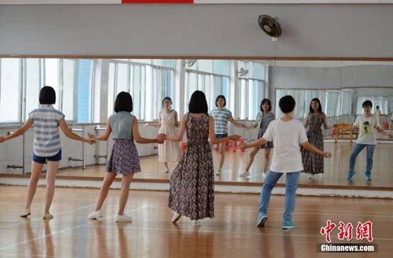 她们利用中午休息时间来到舞蹈室排舞。杨华峰 摄