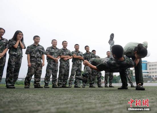 莫丽萍与刘金福正在特战女战士的指导下学习搏击术。杨华峰 摄
