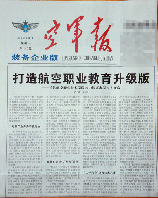 职业教育是落实科教兴国战略和人才强国战略,全面提高国民素质和技能,实现中华民族伟大复兴中国梦的重要途径。作为全军唯一一所国民教育性质的普通高校,我院遵循现代职业教育发展规律,以提高人才培养质量为核心,凝神聚力打造“航空特色”品牌,积极探索办学育人新路径。2014年9月1日《空军报·装备企业版》头版头条对我院办学育人特色作了报道。