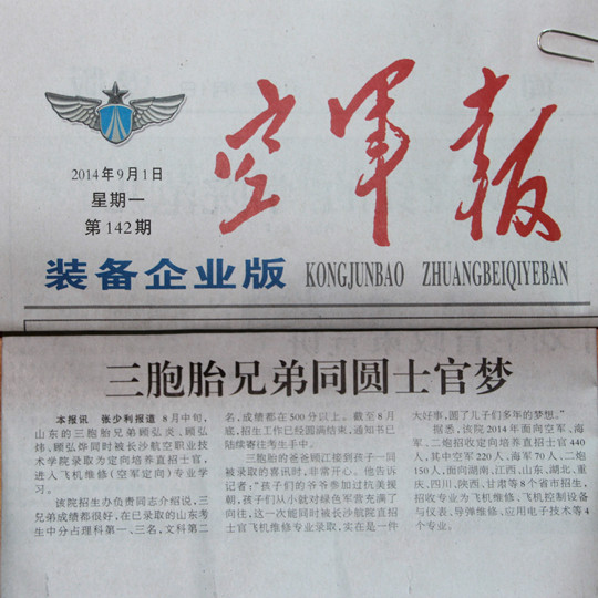 山东三胞胎兄弟同被我院定向培养直招士官飞机维修专业(空军定向)录取,已顺利报道,进入我院学习,开启了真正的空军士官梦大学旅程。2014年9月1日《空军报·装备企业版》以“三胞胎兄弟同同圆士官梦”为题予以报道。