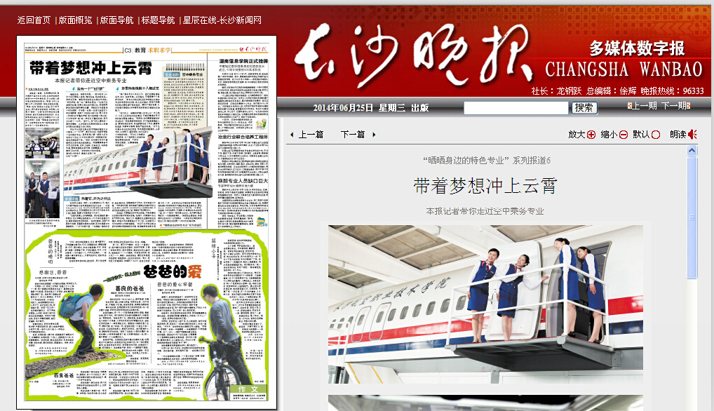 “带着梦想冲上云霄”。《长沙晚报》在6月25日3版教育对我院空乘专业进行了详尽的报道。文章以《带着梦想冲上云霄》为题,从实训条件、能力和才艺要求、就业与薪资水平等多方面对我院空乘专业进行了实例解析和阐述,让广大读者、考生更深入了解我院空乘专业特色。