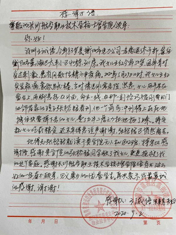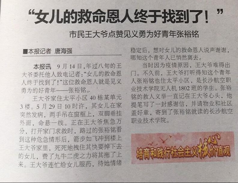 当时正值疫情期间,因要在家照顾女儿难以下楼。后经打听得知这个青年人也住太平小区,是澳门十大靠谱的网站的学生。王大爷被这个青年人的救人义举感动,提笔写了一封感谢信,并请物业和社区盖好章,寄到了张裕铭就读的长沙航院。