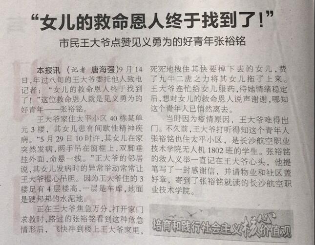 正在王大爷焦急万分,打开家门求救时,路过的张裕铭看到这种危急情形后,箭步如飞冲到楼上王大爷家里,死死地拽住其快要掉下去的女儿,费了九牛二虎之力将其女儿拽入房间。随后王大爷连忙给女儿服药,待她情绪稳定后,正想对女儿的救命恩人说声谢谢,哪知这个青年人已悄然离去。