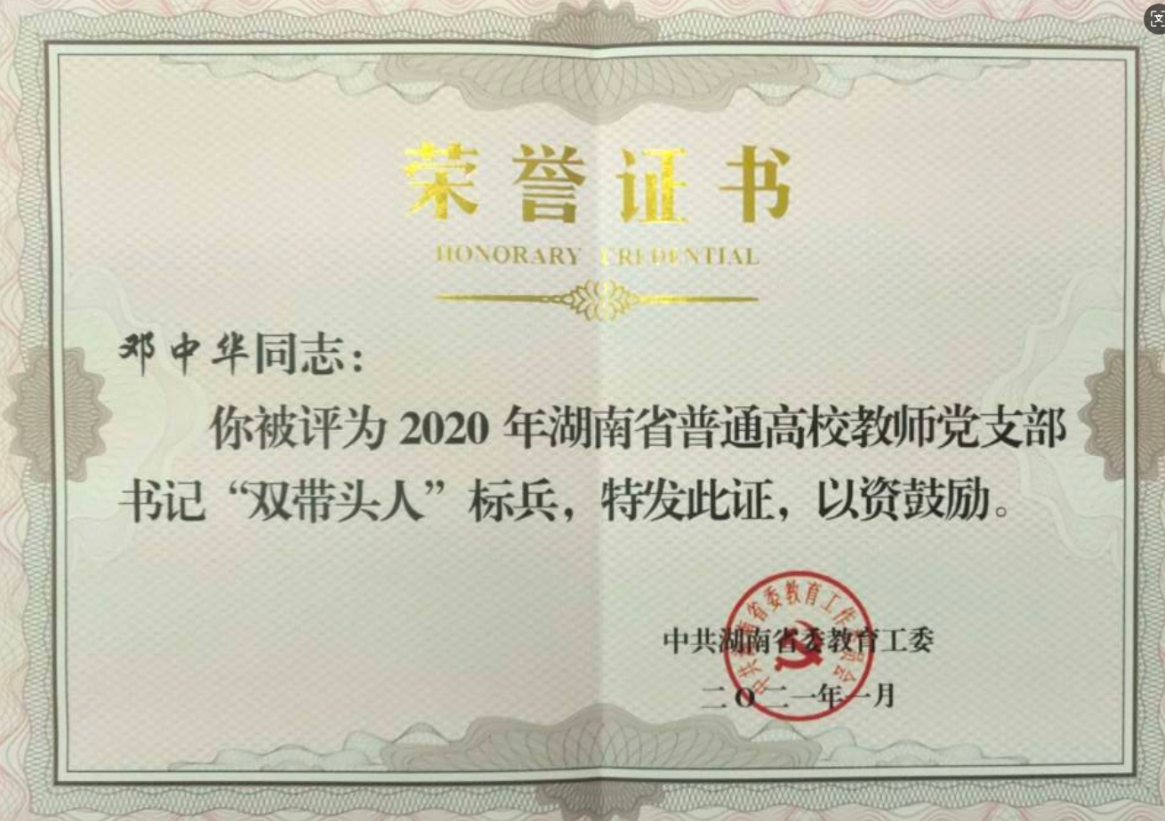 凭借突出的业务能力和深厚的责任感,2020年7月,邓中华被任命为航空发动机制造党支部书记。他始终将党性修养作为自身成长的根基,努力提升党务工作能力,坚持以习近平新时代中国特色社会主义思想为指导,不断推动党建与业务深度融合。他严格执行“三会一课”制度,精心组织参观陈树湘烈士故居、秋收起义纪念馆等红色教育基地,筑牢党员思想根基;通过完善支部制度、开展民主评议和常态化谈心,引导党员增强“四个意识”、坚定“四个自信”、有效凝聚队伍合力。注重推动党建工作与教育教学工作深度融合。他组织开展教师技能比武、教学竞赛、公开课展示等系列活动,带领全体教师围绕专业建设和教育教学改革,全面推进“双高”建设任务落实落细。因在基层党建中的杰出表现,2021年1月,他被湖南省委教育工委评为湖南省普通高校教师党支部书记“双带头人”标兵。