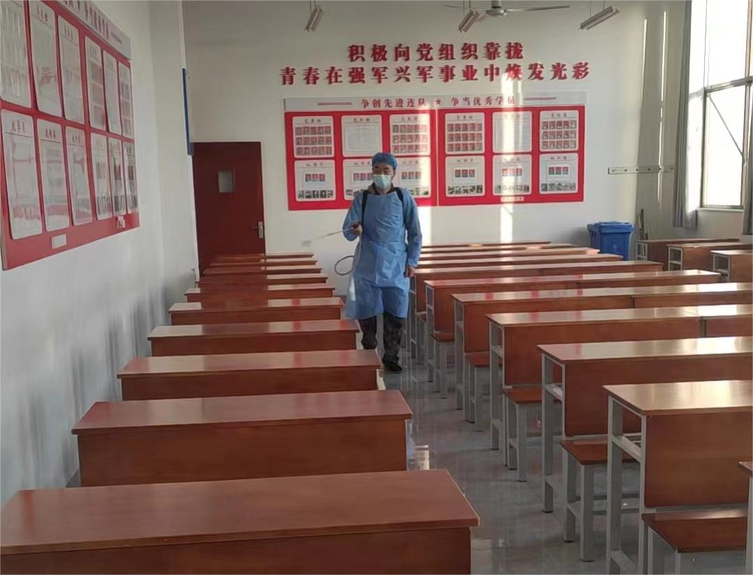在卫生所医务人员的指导下,物业公司集中对校园进行了全面清扫,对协同中心大楼、产教融合大楼、军士营区、食堂、体育馆、公共卫生间等重点场所进行了消杀,高标准完成了消杀任务。对教室门把手、楼梯扶手等高频接触的重点部位,在喷洒消毒液后进行擦拭,确保全面消杀,重点突出,不留死角。